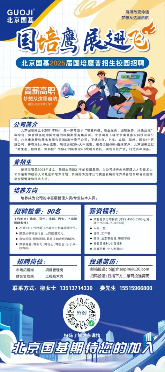 北京国基成立于2001年8月,是一家专注于"智慧科技、物业服务、团餐服务、绿色运维"等综合一体化服务的中国卓越的机构类服务集成商。北京国基下辖北京国基伟业科技有限公司、北京康享餐饮服务有限公司等5家全资子公司, 北京、上海、成都、郑州、西安5个区域公司,并布局9大中心城市,现已进驻30+大中城市,服务全国400+高端客户。北京国基正以"新生态、新绿色、新科技"为核心的新物业4.0战略为依托,实现百亿产值,打造百年国基。