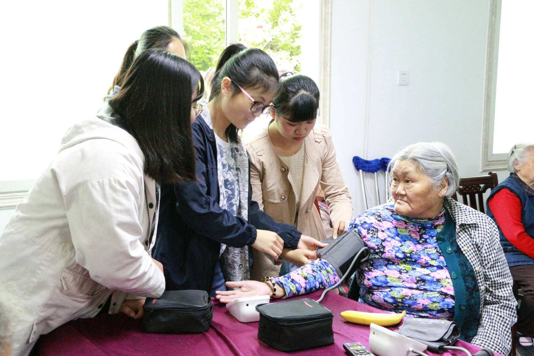 活动初始,志愿者们有序的开展工作,为老人测血压、讲解平常饮食的禁忌知识,并科普了一些基础的养生知识,解答了老人在生活饮食起居上的疑问。紧接着,志愿者们陪同老人散步、聊天,按摩,了解老人平时生活中遇到的问题并给予解答,活动历时一个半小时后结束。