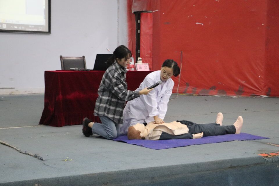 首先,叶盈老师讲述了如何判断患者是否需要心肺复苏,主要从意识、呼吸、心跳三个方面进行判断。随后,她讲述了心肺复苏术的分类:胸外心脏按压,人工呼吸,并着重强调了救助过程中需要注意的问题,避免了对患者造成二次伤害。在同学们对心肺复苏知识有了初步了解后,叶盈老师开始现场实践教学。她在现场准备的人体模型上进行了一套完备的标准示范。全场同学聚精会神,仔细观察学习着她的动作。同学们踊跃学习着叶老师的动作,同时叶老师也在一旁耐心指导纠正。