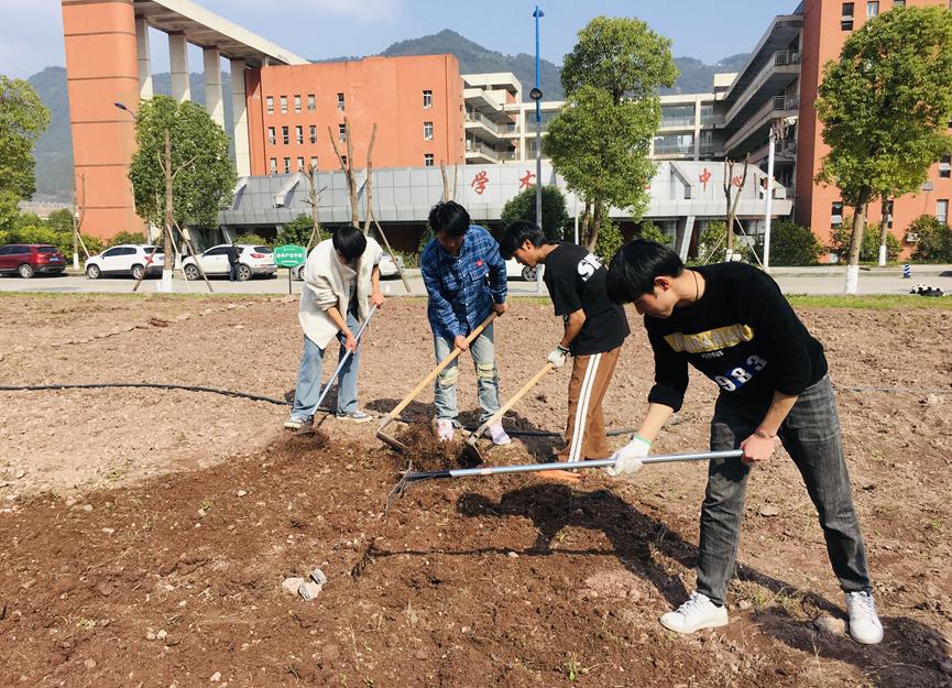 同学们按照指示提前来到西大门出口一侧集合。指导教师谢佳佳、王馨彤向同学们讲述此次劳动教育课的意义、任务安排以及注意事项,特别强调在劳动过程中同学们要以安全为主,量力而行。陈丹曾是农学专业毕业,向同学们示范播种技术。活动中,同学们在老师的带领下,认真学习翻土和除草技巧,大家分工合作,有条不紊,你追我赶,乐在其中。