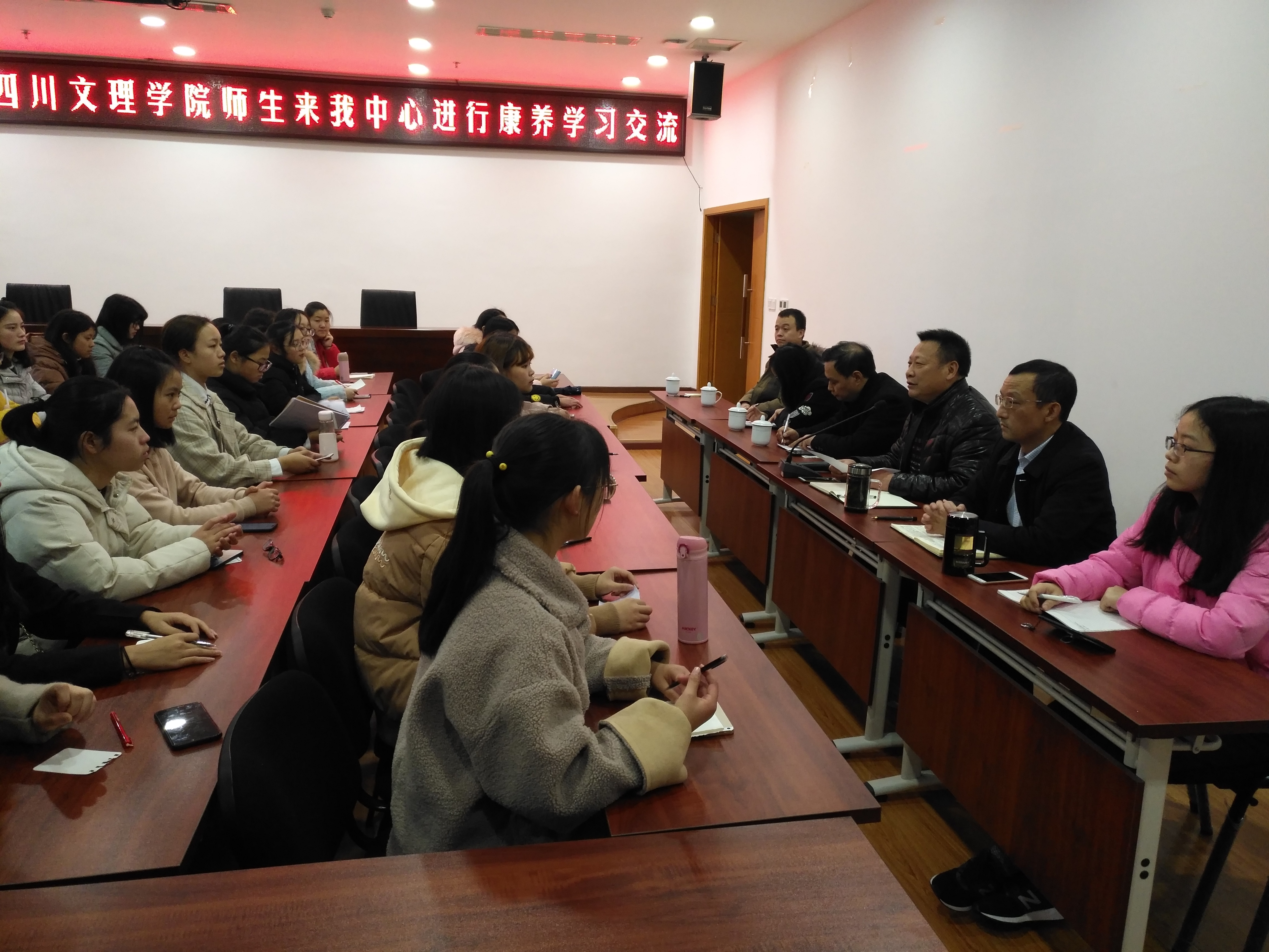 2018年12月6日下午,公司到达州善泽健康管理公司开展教研活动和专业认知见习。公司经理靳能泉、教研室主任张俊浦与健康服务与管理教研室崔俊营、刘孝英、叶盈等老师以及2018级健康服务与管理专业参加。达州善泽健康管理公司经理赵健带领相关人员全程参与。